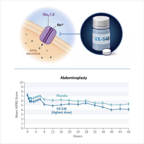 2023年8月3日,发表在《新英格兰医学杂志》上的文章表明,Vertex药厂发明的VX-548——一种口服非成瘾性镇痛药——在多中心临床试验后对人的急性痛疼有显著抑制作用。在用于治疗腹壁整形手术和拇囊炎切除手术后急性疼痛的临床前数据和II期临床试验方面,该研究显示出积极结果。与阿片类药物相比,该类药物在提供更好镇痛效果的同时,可以避免成瘾等副作用。VX-548已获美国FDA(食品药品监督管理局)授予快速通道资格与突破性疗法认定,用于治疗中度至重度急性疼痛。