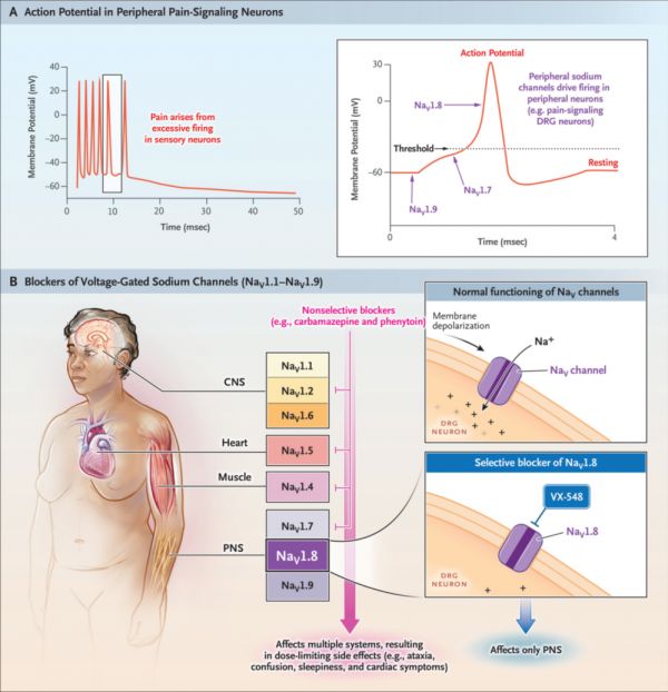 再者,经过数年研究,科学家们已经确认通过阻断外周神经系统中动作电位的形成,阻断痛觉信号传导实现镇痛是可行的,也深知Nav1.7、Nav1.8、Nav1.9对于痛觉信号传递的重要性,却一直没有一款基于该机制研发出的药物。在这个层面上,饶教授给出VX-548——“显示痛觉分子机理的基础研究已经在临床上初现曙光。这一曙光,是物理学家、生理学家、遗传学家、药理学家、临床医生前赴后继上百年研究的结果”——这样的评价是特别确切的。