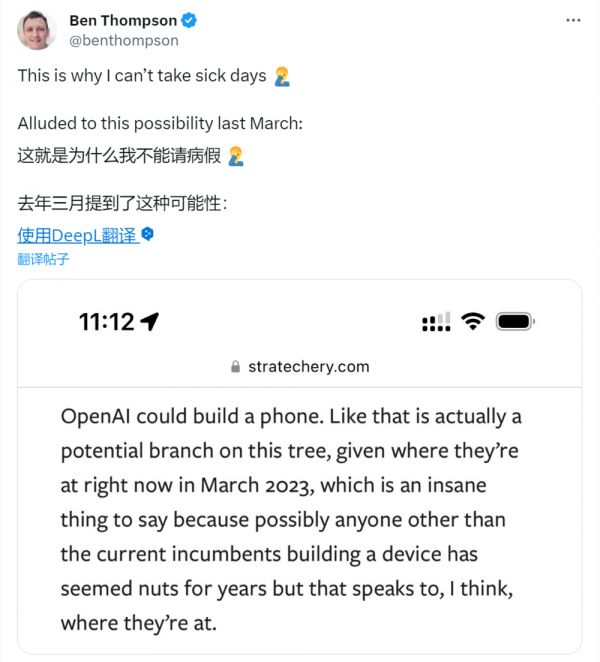 对此,著名分析师 Ben Thompson 在推特上援引了一篇自己写于三月的文章。文章讨论了 AI 产品变革,曾预测 OpenAI 作为一家消费科技公司的崛起,“ OpenAI 可以造一款手机。”