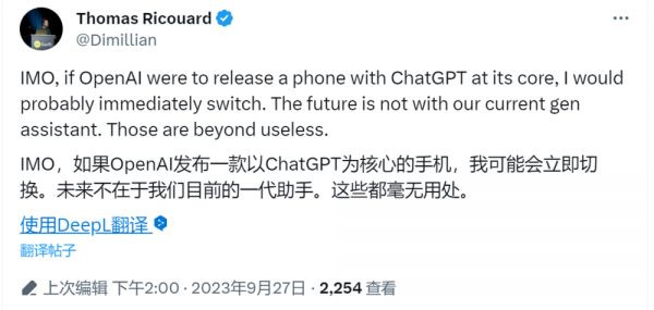 Medium 的 iOS 工程师 Thomas Ricouard 在推特上写道,“在我看来,如果 OpenAI 发布了一款以 ChatGPT 为核心的手机,我可能会立刻切换过去。未来不属于现在这些生成助理,那些毫无用处。”