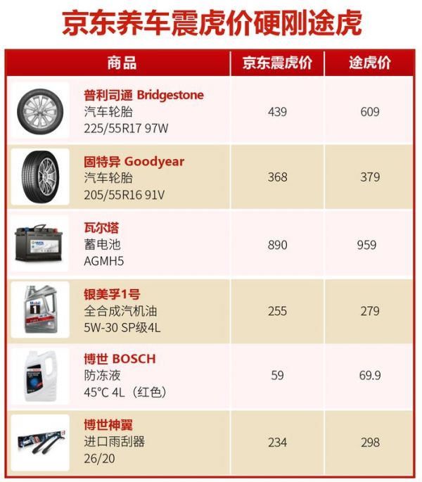 从京东养车的活动页面来看,“震虎价”覆盖的众多产品都是途虎养车平台售卖的同款大牌,包含轮胎、保养、配件、蓄电池等多个品类,但无一例外都给出了更低的价格,有的甚至直接打了5折。