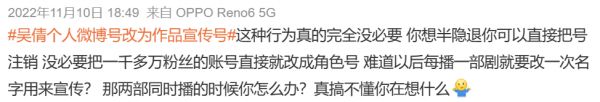 哪怕是复出阶段,吴倩依旧任性。陷入舆论漩涡后不久就退网,将个人微博号改为角色宣传号。老粉无言以对,新粉一头雾水。