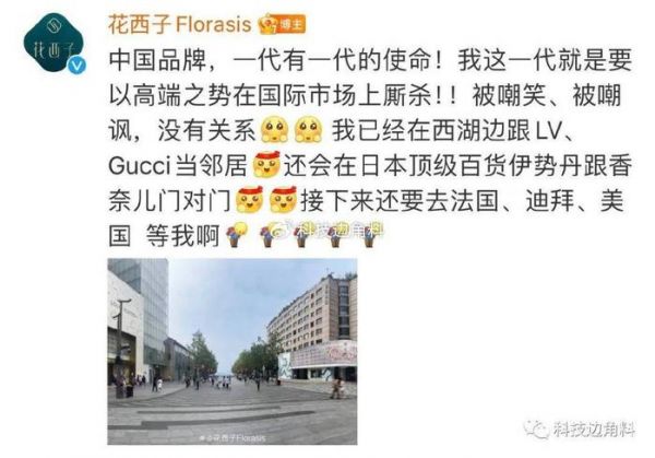 9月26日,花西子官方微博发了一条气势恢宏要比肩世界高端品牌的微博,翻译成白话文大意是:我,花西子,想卖高价。