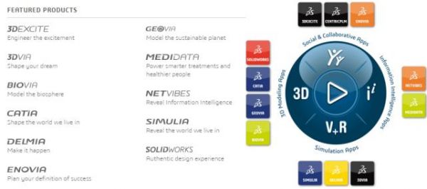 3D建模模块对应CATIA、SolidWorks、GEOVIA(地质建模与仿真软件)、BIOVIA(材料与生命科学研发软件)产品线。社交协作模块应ENOVIA(PLM协作创新软件)、3DEXCITE(3D 可视化软件)、3DSWYM(社交网络软件)产品线。仿真模块对应SIMULIA(工程计算与仿真软件)、DELMIA(工艺规划设计与仿真软件)、3DVIA(3D空间规划软件)产品线。信息智能模块对应 EXLEAD(信息情报和业务分析软件)、NETVIBES(数据智能可视化软件)产品线,如图 1 所示。