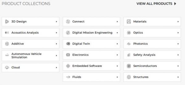 Ansys是CAE领域产品线最为完善的厂商,目前共有17类、91个产品。Ansys自成立以来,通过不断整合,将其产品扩展为 Ansys Mechanical系列、Ansys CFD(Fluent、CFX)系列、Ansys Ansoft 系列以及 Ansys Workbench和EKM等,形成了包括结构、流体、电磁、热、光学、3D设计、嵌入式软件、平台工具、半导体、系统、虚拟现实等在内的完整CAE产品线。其解决方案不仅覆盖航天航空、国防、汽车、能源、医疗等领域,也涉及数字孪生、虚拟现实、5G、高性能计算、自动驾驶、工业物联网等前沿领域,如图2所示。