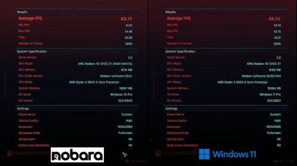 使用《赛博朋克 2077》的内置基准测试,游戏在 Fedora Linux 修改版本 Nobara OS 下,可以达到 63.72 FPS 的平均帧率。在 Windows 11 相同的设置下,帧率只有 48.55 FPS。