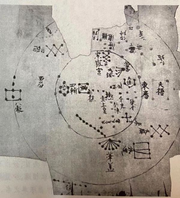 敦煌紫微宫星图,年代约为唐初期,已从古代盖图发展为北极紫微区加赤道分区的新型天文图。