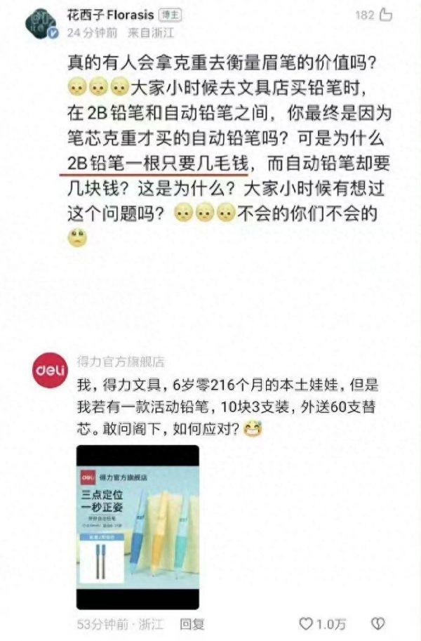 得力官方账号直接在评论区回怼:我,得力文具,6岁零216个月的本土娃娃,但是我若有一款活动铅笔,10元3支装,外送60支替芯。敢问阁下,如何应对?