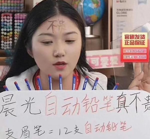 晨光也没有放过这次送过来的流量,晨光主播直接将“不贵”两个字写在了额头上,让那些刷到的网友瞬间就明白这是什么意思。与此同时,晨光主播还将花西子做了一个换算。一支花西子眉笔可以买12支自动铅笔,150支2B铅笔。这样对比下来,晨光文具确实也很有性价比了。