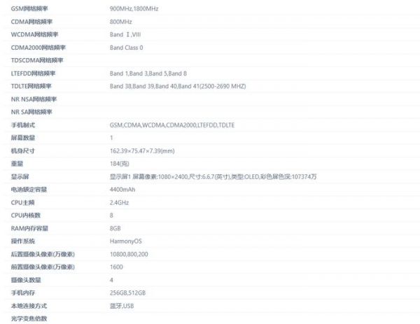 ▲ 电信设备终端网截图IT之家从中获悉,这款新机尺寸为 162.39×75.47×7.39mm,重量为 184g,正面配备 6.67 英寸 OLED 直屏,分辨率为 2400x1080p,采用居中打孔屏设计。该机搭载 4400mAh 额定电池,支持 66W 有线快充。