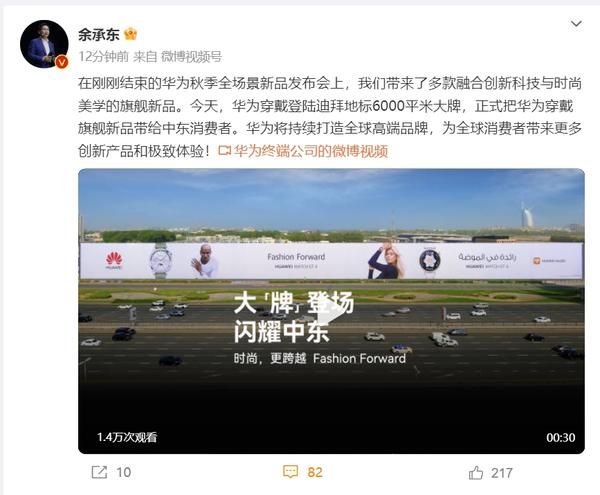 余承东:华为穿戴设备登陆迪拜地标6000平米大牌