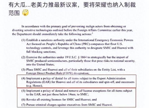 然而,出乎所有人意料的是,14名美国众议院议员要求将荣耀列入实体名单。