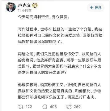 结果就在卢克文工作室如日中天、不断招兵买马之际,居然翻车了。卢克文的翻车我是真没想到,虽然他的学识撑不起他所写的庞大题材,但他既拥护体制,也没什么极端的观点。他这次翻车纯属祸从口出,写完《塔利班传》后在微博上发了一段不合时宜的感慨,说自己“被拉登那种对自己民族文化的深爱之情,渴望救国救民族的情绪深深震撼到”。他发完之后自己也觉得不对劲,于是5分钟内就删了,却被他团队同事以迅雷不及掩耳盗铃之势转发到了知乎,再加上后来越描越黑的声明,酿成了一场舆情灾难。