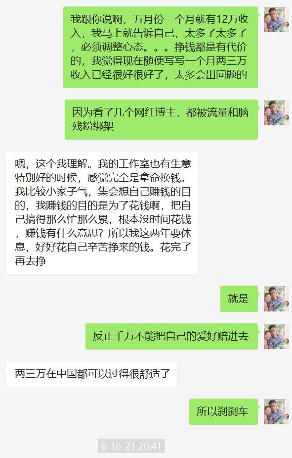 我曾在《四十而立,归来仍是少年》那篇里说过,人难免为声名所累,知道你的人越多,影响力越大,招致的非议就越多,受到的限制也会越多。声名固然可以带来利益,却也必然伴随着是非。对我来说,要如何进行选择早已有了答案——假如挣点钱非得招惹是非,那我宁可不要挣这个钱。所以我从一开始就没打算要扩大自己的影响力。