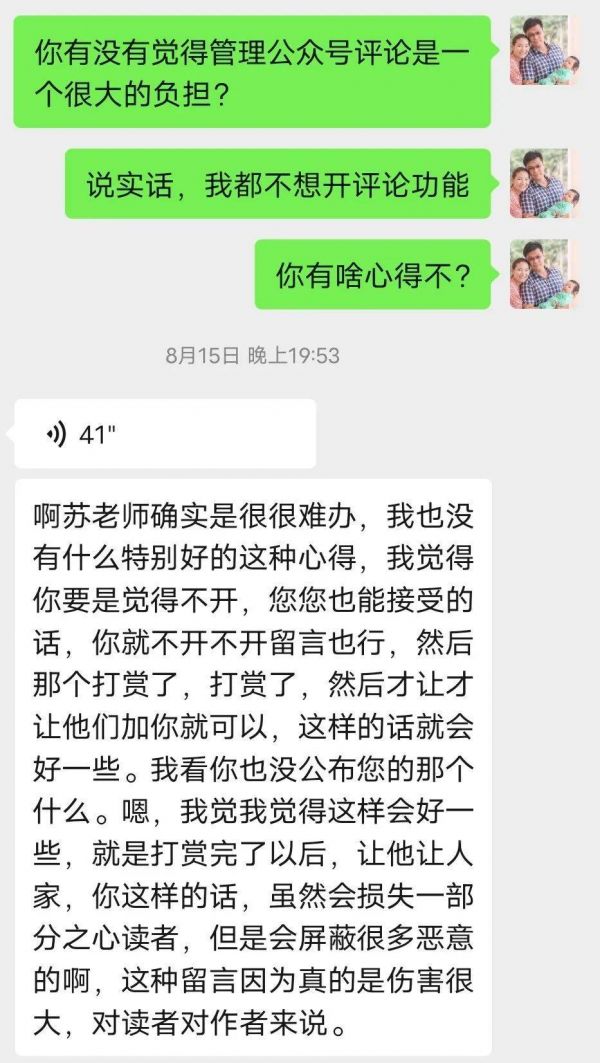 好几个写公众号的同行,都跟我有着相同的感受。公众号的精选评论功能的设计机制是好的,避免读者相互之间撕逼;但我特别不喜欢这个功能,因为必须去手动管理留言,想不看都不行。从读者的角度看起来,评论区可能一片和谐,其实负能量都是作者在承受。为了保证客观,只要言语不带攻击性,我会把正反双方有观点的留言都精选出来。可即便我已经筛选过了,有的朋友看了我一些文章的留言之后依然会来问我,怎么承受得了这么负面的评论?我说你还没看到那些没放出来的呢,那才叫可怕。