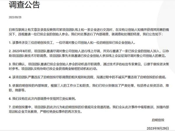 9月29日,启明创投针对该事件发布了内部调查公告。对涉及的三名员工分别做出了严肃处理,包括停止投资活动、降职、降薪等。