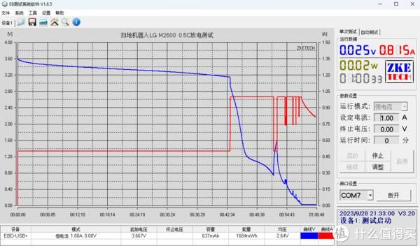 第二调整放电电压为0V,压榨性放电测试,先用0.5A放电,后又调整1A,反复调整了几次,又放出637mAh的电,加上第一次不足1200mAh,和原来的2600mAh相差甚远。