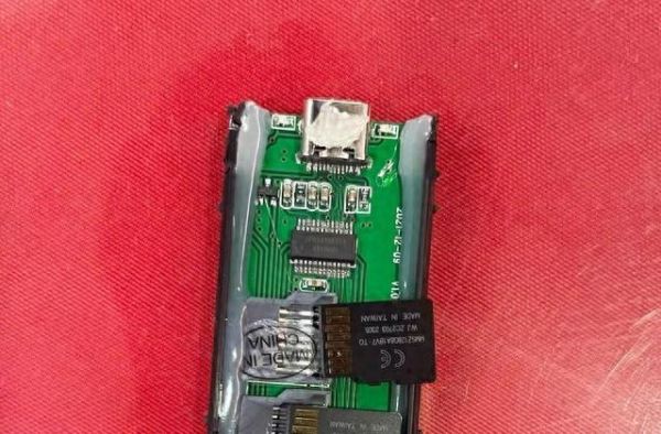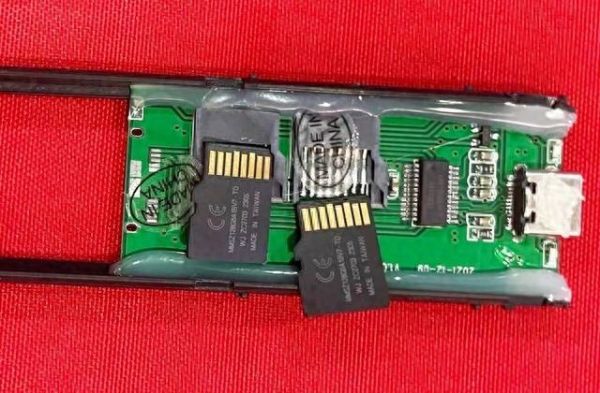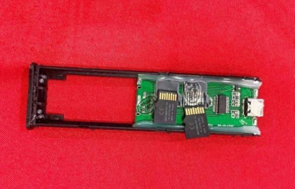 从上图看,这是用M.2固态硬盘盒改造而来的,拆去外壳,内部框架用热熔胶粘着一块绿色的PCB,上面没有常见的那几个型号的NVMe/SATA主控芯片和M.2插槽,但是赫然出现了两个MicroSD卡(也就是TF)卡座,外加一个TSOP古老封装的主控芯片,这是什么操作?我们知道,常见的MicroSD卡读取速度在100MB/s左右,写入速度也就几十个MB/s,即使把两个TF卡槽做成RAID0,写入速度也就是100多MB/s。