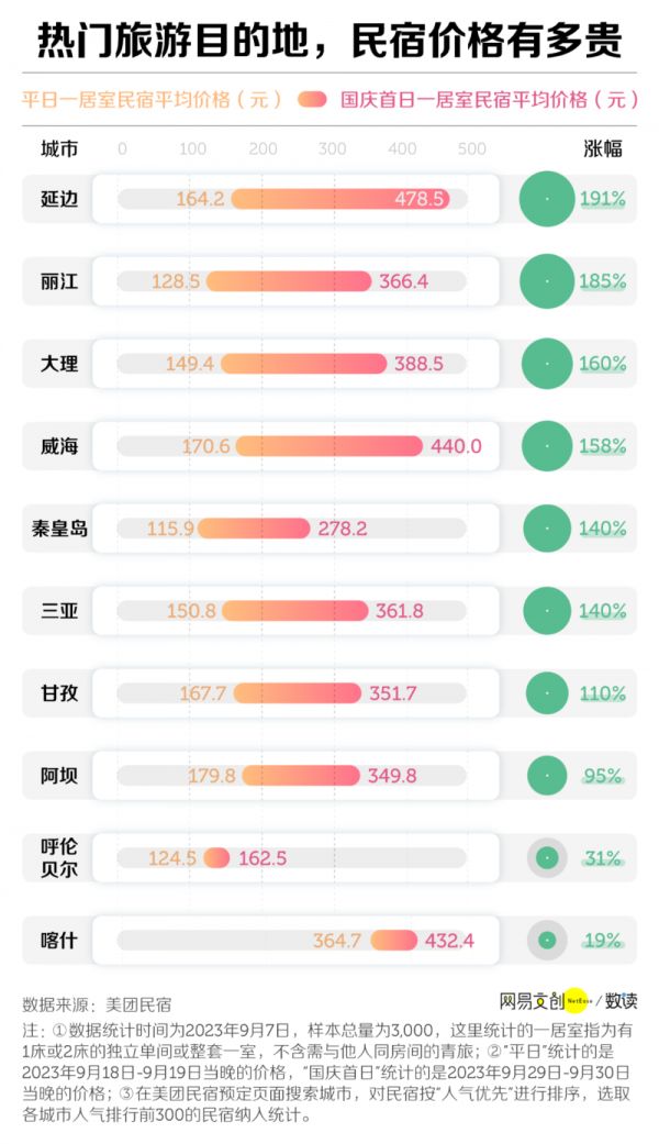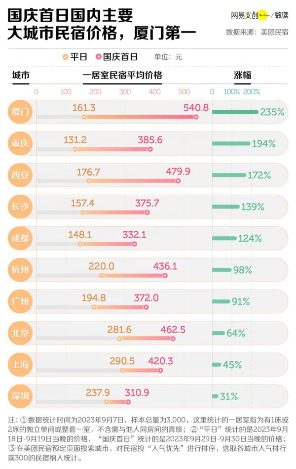 其中,作为沿海网红城市的厦门,国庆时的民宿均价比北上广深还贵,超过 500 元,较非节假日上涨了两倍多。