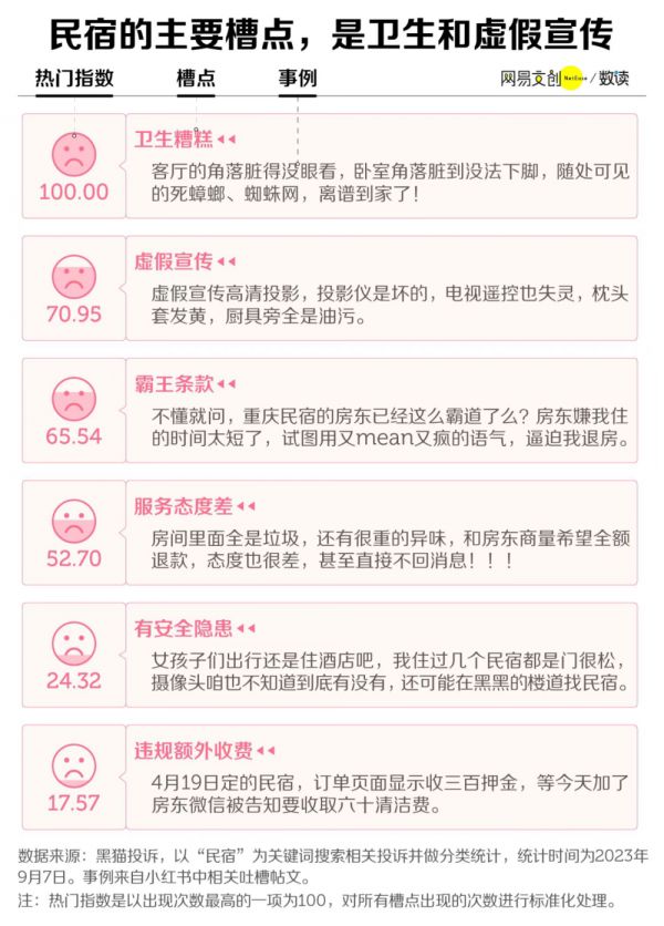 在黑猫投诉平台上,含“民宿”该关键词的投诉内容显示,民宿被投诉最多的便是卫生糟糕。