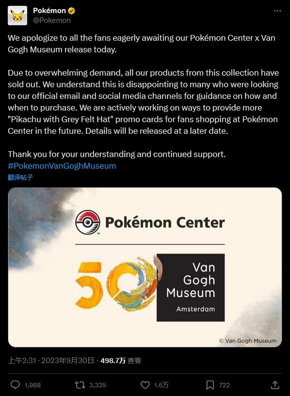 宝可梦梵高博物馆联动周边被抢光 官方道歉