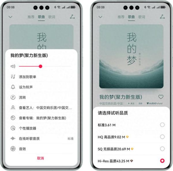 华为音乐Hi-Res曲库在古典、爵士等传统流派上的优势不必多说,这次在流行内容上进一步扩充,真正实现了“Hi-Res宝藏曲库”!如果已经等不及想听听这些宝藏音乐,打开华为音乐APP,点击带有金色Hi-Res小图标的歌曲进入播放页,在音质选项中选择“Hi-Res品质”即可体验啦!火爆全网的发布会开场曲《我的梦(聚力新生版)》也在华为音乐独家首发,同样支持Hi-Res!