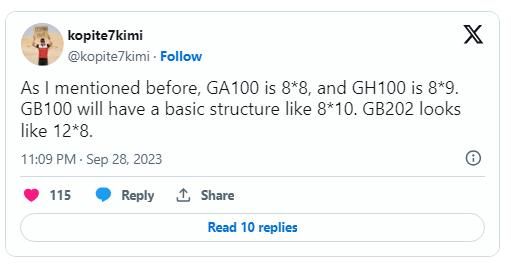 消息源 Kopite 表示 GB100 共有 8 组 GPC,每组 GPC 内包含 10 个 TPC,推测每个 TPC 内含有 2 个 SM,相当于有 160 个 SM。