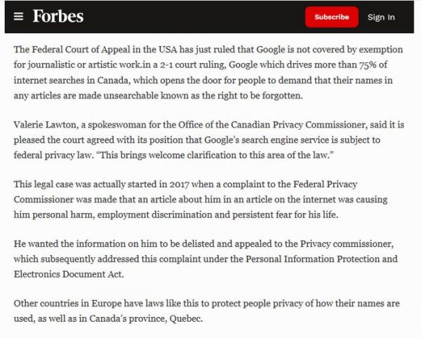 有关的案件可以追溯到 2017 年,有当地民众向联邦隐私专员投诉称,一篇关于他的网络文章对他造成了人身伤害、就业歧视以及对生命的持续威胁。他希望将自己的信息从搜索引擎提供的搜索结果中删除,并向隐私权专员提出申诉,该专员根据加拿大《个人信息保护和电子文件法》处理了这宗投诉。