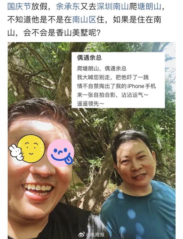 华为余承东假期又去爬塘朗山了,网友用iPhone和他合影……