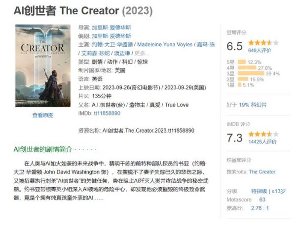 科幻电影《AI 创世者》评分出炉,豆瓣 6.5、IMDB 7.3