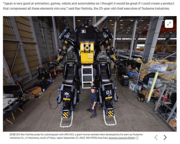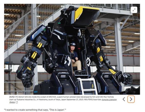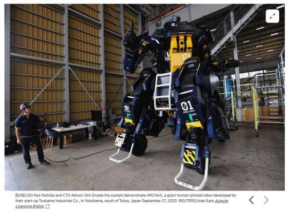 ▲ 图源路透社,下同这款机器人的学名为 ARCHAX,灵感来源为“始祖鸟”(archaeopteryx)。据介绍,这个机器人配有一个驾驶舱,内部的监视器可接收外部摄像头的影像,驾驶员还可以通过摇杆来操纵其手臂、手掌。