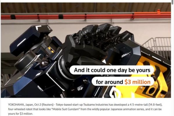 日本新创公司推出“高达”外形机器人:高4.5米,售300万美元