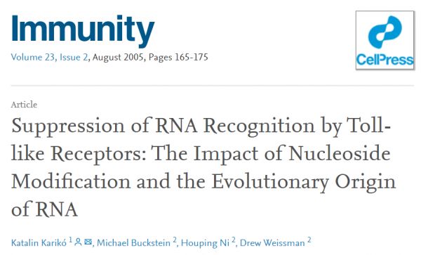 2005年,两名科学家在Immunity期刊上发表了他们划时代的研究。论文中,他们富有前瞻性地写道,这一突破将是设计治疗用RNA的关键。再后来,他们发现一种特殊的修饰不仅能减少免疫反应,还能大大增加mRNA的翻译效率,产生更多蛋白。