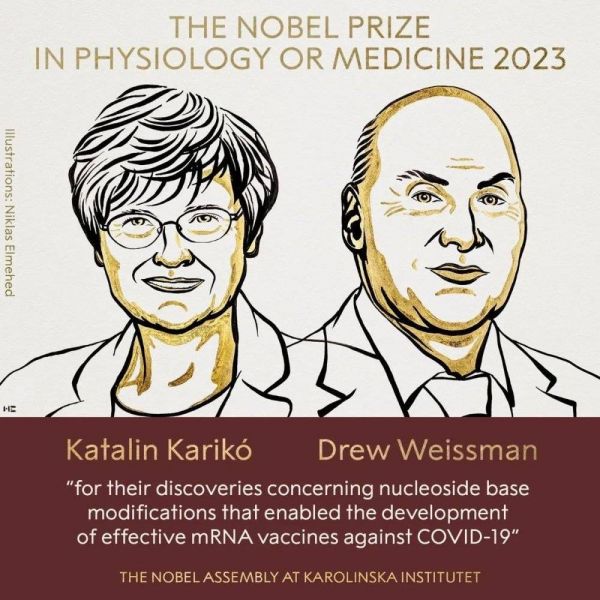 北京时间 2023 年 10 月 2 日,瑞典卡罗琳医学院宣布,将 2023 年诺贝尔生理学或医学奖授予 Katalin Karikó 和 Drew Weissman 以表彰他们在“关于核苷碱基修饰的发现,使开发针对 COVID-19 的有效 mRNA 疫苗成为可能”。