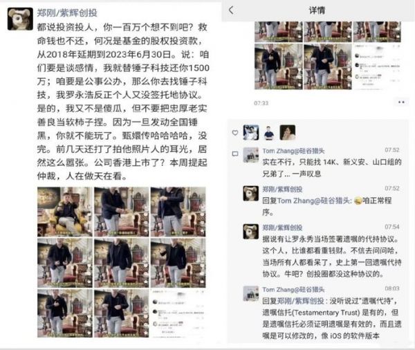 继年初锤子科技前投资人、紫辉创投CEO郑刚炮轰罗永浩后,上个月初他的“小作文”又来了,称罗永浩拖着1500万救命钱不还。