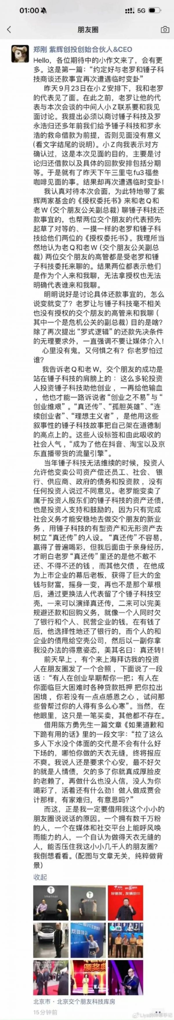 9月24日凌晨,郑刚再发布“各位期待中的小作文”,抨击罗永浩。并称,“约定好与老罗和锤子科技商谈还款事宜,再次遭遇临时变卦。”