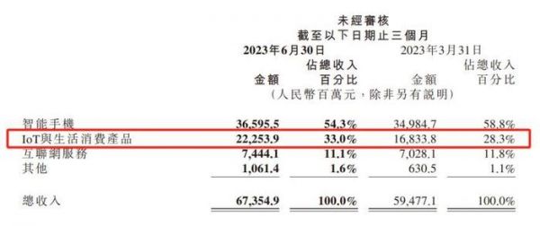 小米特别在财报中提到,环比来看,IoT与生活消费产品的收入从2023年第一季度的168亿元大幅增加了32.2%至223亿元,这主要是因为智能大家电及若干生活消费产品收入的增加。