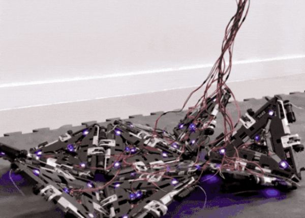 和我们常见的设计初期就固定成某个形状的机器人不同,瑞士洛桑联邦理工学院的团队设计出来的机器人 Mori3,由一堆零散的“三角形”组成,在完成特定任务时,这些三角形会自动组合,组成最合适完成任务的形态。