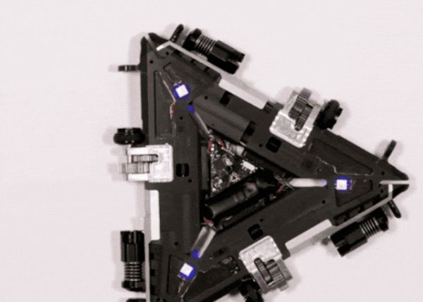 研究员介绍,Mori3 的厉害之处在于,三角形不但可以任意拆装组合,三角形中其实含有可以通信沟通的部件,三角形之间由此可以相互沟通,进行自我组合。