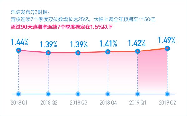 用户的强劲增长,带动乐信业务规模大幅上涨。2季度,乐信平台促成借款260亿元,比去年同期166亿增长57%;在贷余额406亿,比去年同期247亿增长64.5%。资产质量持续表现保持稳定,超过90天的逾期率为1.49%。