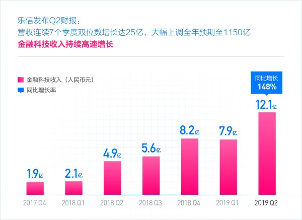 金融科技收入依然是乐信增长最快的部分。2019年2季度,乐信通过为各类金融机构服务获得的金融科技收入达到12亿,比去年同期4.9亿增长148%。