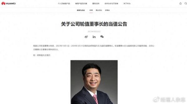 华为:2023年10月1日-2024年3月31日由胡厚崑当值轮值董事长