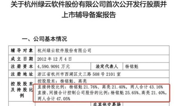 来源:绿云上市辅导备案报告据上市辅导备案报告显示,杨铭魁与高亮为控股股东,两人直接、间接持股分别为25.65%、21.40%,合计 47.05%。