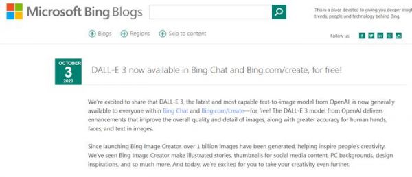 IT之家 10 月 4 日消息,微软今日宣布,OpenAI 最新的 DALL-E 3 图像生成器现在可供所有 Bing Chat 和 Bing Image Creator 用户免费使用。