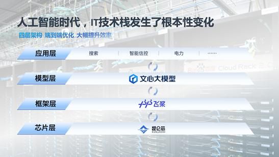 4、人工智能时代的到来,让IT技术栈从三层变成了四层:底层仍然是芯片层,但主要的芯片已经不是CPU ,而是以GPU为代表的新一代适合并行大规模浮点运算的芯片;上面我们叫做框架层,就是深度学习的框架,像百度的PaddlePaddle飞桨、Meta的PyTorch、谷歌的TensorFlow都是在这一层;再上面一层是模型层,Chat GPT、文心一言等都属于模型层;最上面是应用层,以后AI时代的原生应用,都会基于大模型来进行开发。