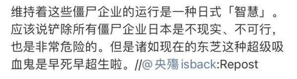 这算是一个折中之法,让这些老家伙们有机会再度焕发生机;员工也依然有工作,不至于寻死觅活;日本银行和政府也不至于被这些僵尸拖死,算是皆大欢喜。