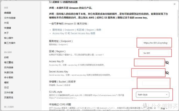 打开obsidian后来到设置这里,先启用第三方插件,搜索remotely save,安装完成后,在下面启用即可。进入插件设置界面,这里选择“S3或者兼容S3的服务”,服务地址从群晖界面这里复制,区域填入tw-001,access key id 和secret access key 就填刚刚生成的那个。存储桶的名字就输入刚刚创建的桶的名字,我这里就是sync4note,这里S3 url style 选择path-style。之后回到主界面,点击同步就可以了。