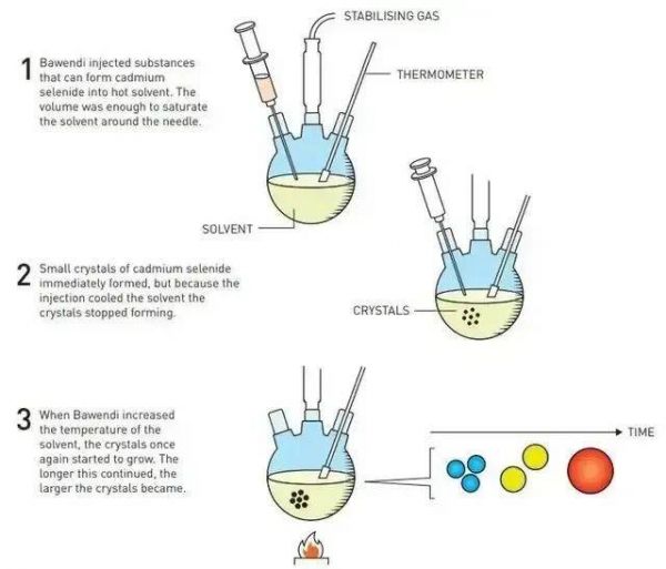 1993年,蒙吉·G·巴文迪(获奖的第一位)则是通过改进化学生产方法,制作出了几近完美的量子点[3]。