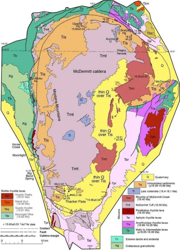 麦克德米特火山口全貌图,图/Lithium-Rich Claystone in the McDermitt Caldera, Nevada, USA: Geologic, Mineralogical, and Geochemical Characteristics and Possible Origin https://doi.org/10.3390/min10010068