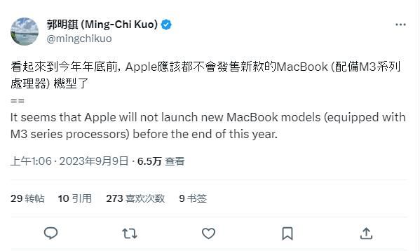 不过天风国际分析师郭明錤的说法有所不同,根据其说法,相关 MacBook Pro 型号预计将在明年发布。